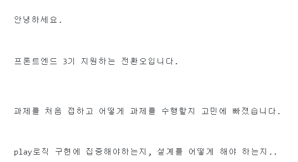 비즈니스로직은 어느정도 비슷할 수 있었지만, input에 대한 처리나 ui렌더링을 순차적으로 짤 수 없는게 많이 당황스러웠습니다. 이는 1주차 과제 제출 메일에 여실히 드러납니다.
